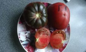 Плоды имеют плоскоокруглую форму, часто с выраженной ребристостью в области плодоножки. Основной цвет зрелого томата — насыщенный розово-малиновый. Однако его уникальность заключается в проявлении глубокого фиолетового «загара» на солнечной стороне.