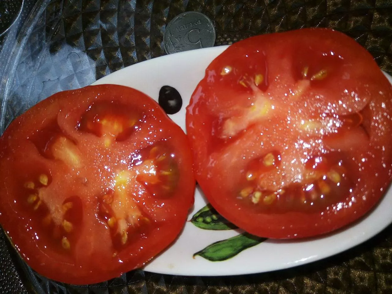 Крупный размер и безупречно округлая форма делают плоды идеальными для нарезки и салатов. Мякоть не водянистая, не течет на тарелке, хорошо держит форму. Одного такого помидора, достигающего в отдельных случаях рекордных 2000 граммов, действительно может хватить для приготовления салата на всю семью.