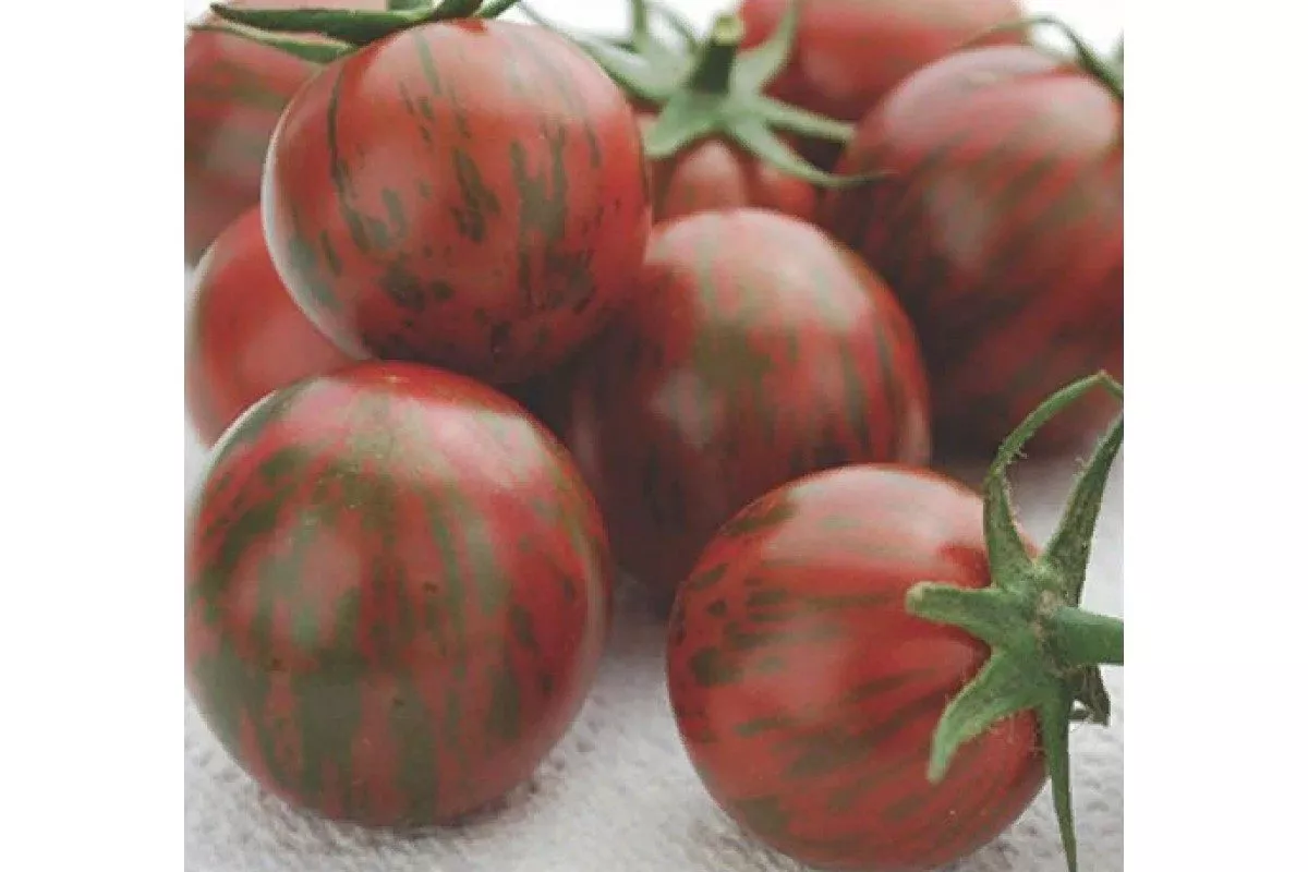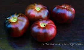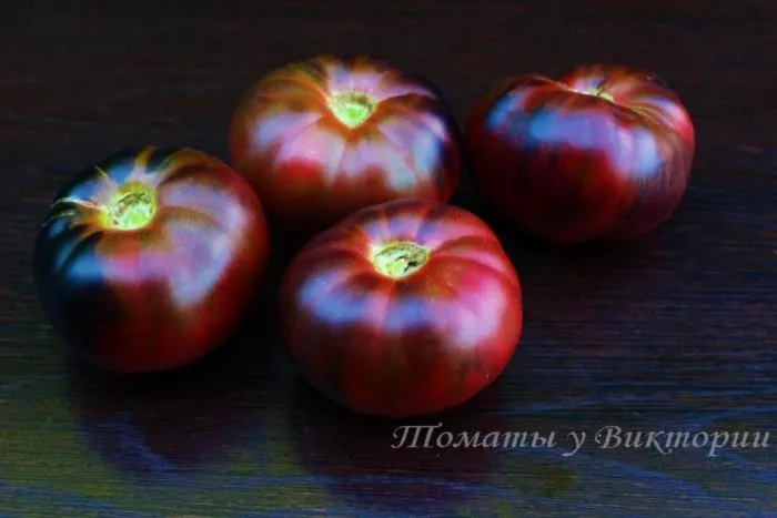 Главная отличительная черта сорта — его плоды. Их уникальная окраска развивается постепенно. В фазе технической спелости томаты тёмно-зелёные с характерным тёмным пятном у основания. По мере созревания проявляется сложный антоциановый румянец, который в полной зрелости описывается как фиолетово-чёрно-коричневый. Интенсивность этого оттенка напрямую зависит от количества получаемого солнечного света.