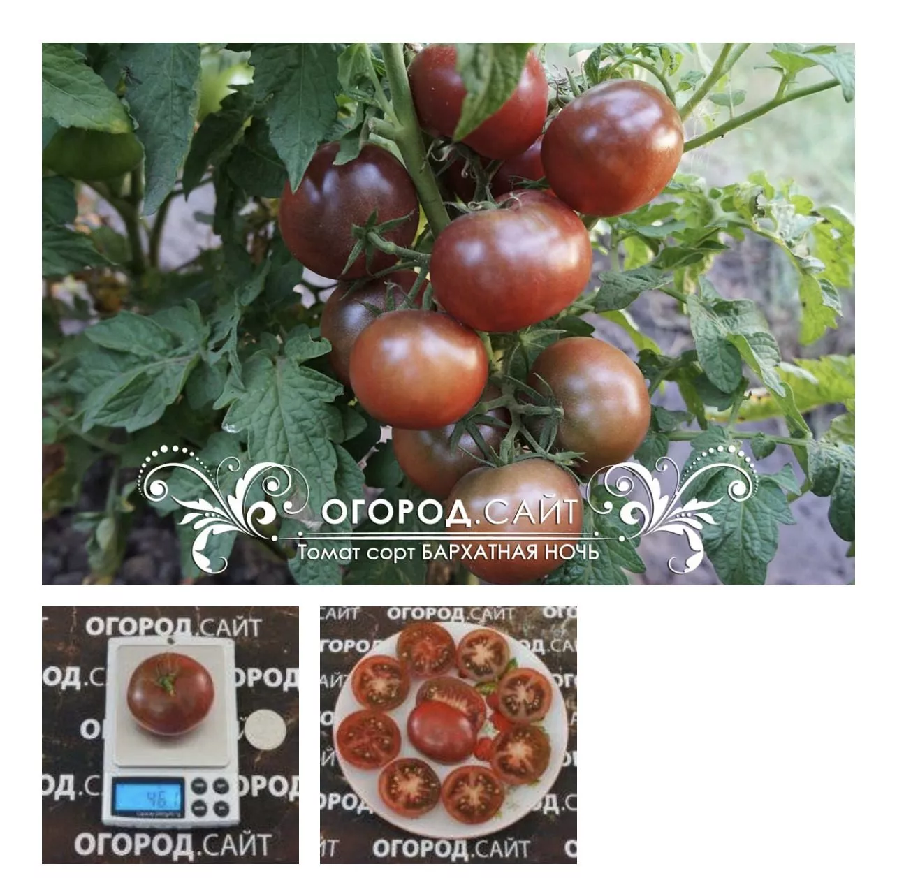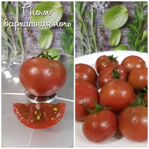 Их окраска — визитная карточка сорта. В незрелом состоянии у плодоножки присутствует темно-зеленое пятно. По мере созревания цвет трансформируется в глубокий шоколадно-бордовый с фиолетово-черными плечами. Кожица имеет матовый, бархатистый отлив, который особенно заметен на солнце и за который сорт получил свое поэтичное название. Средняя масса плодов соответствует заявленной — от 50 до 80 граммов.