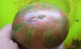 Полная биологическая спелость раскрывает всю палитру: основной фон становится насыщенным темно-розовым, который на плечиках переходит в глубокий шоколадный или бордовый оттенок. Важным акцентом, подтверждающим зрелость, выступают контрастные зеленоватые или оливковые полоски у плодоножки, которые не исчезают. Именно этот устойчивый штриховой рисунок является сортовым признаком.
