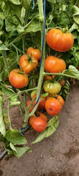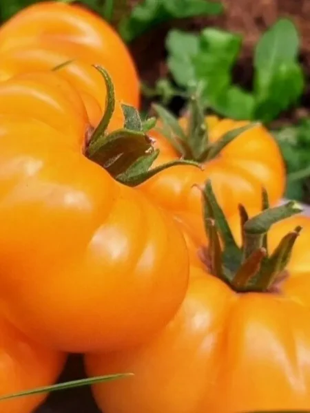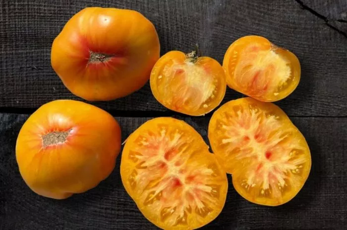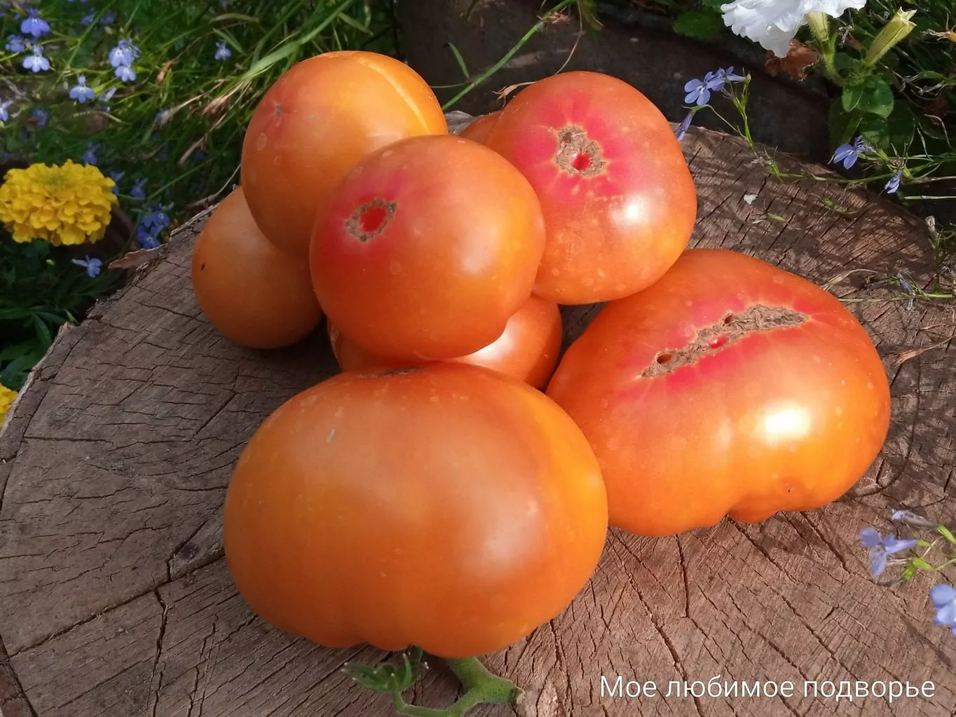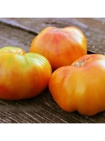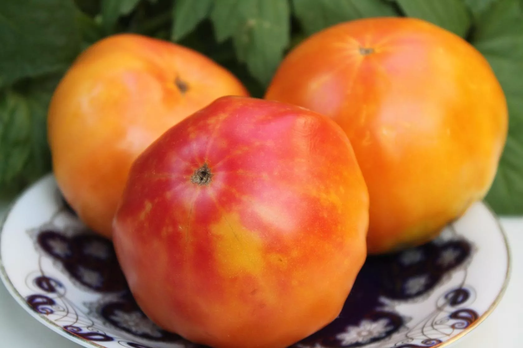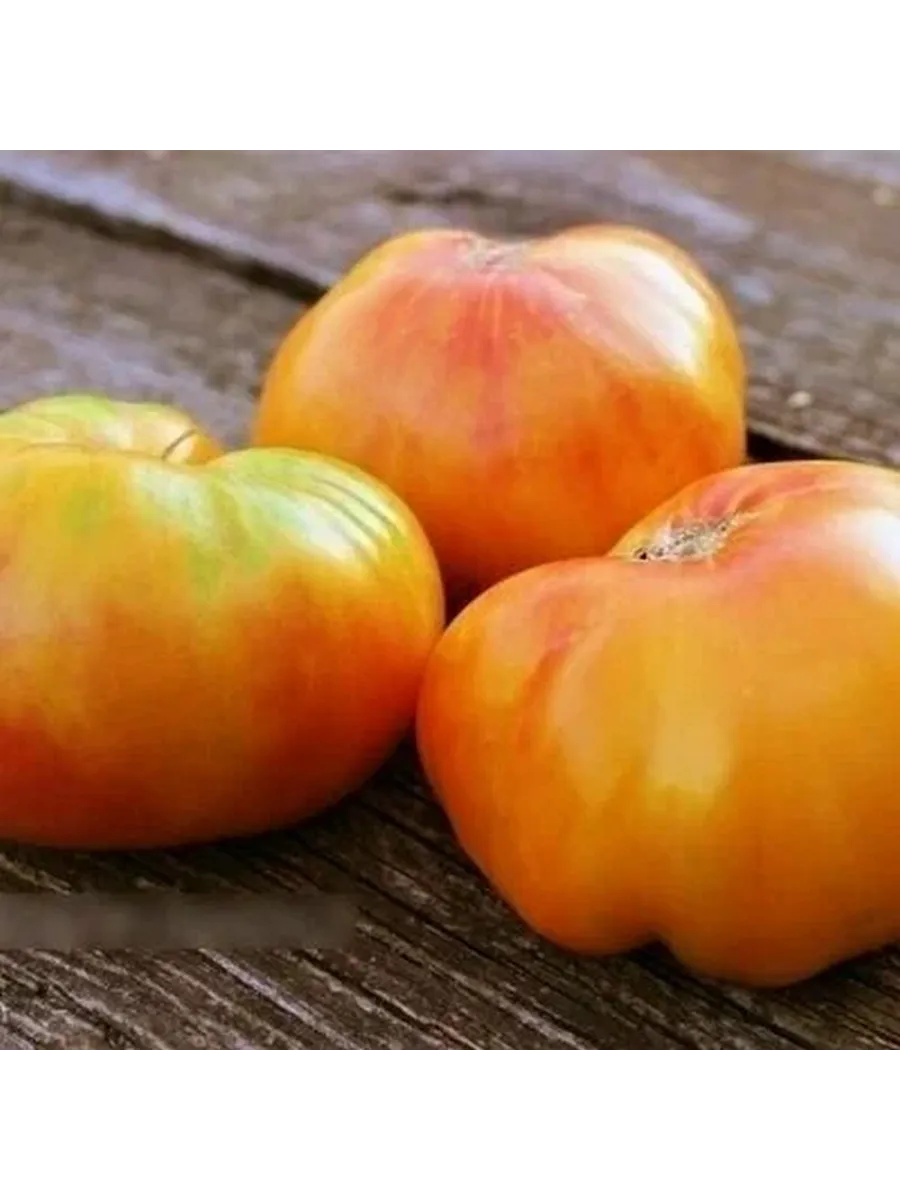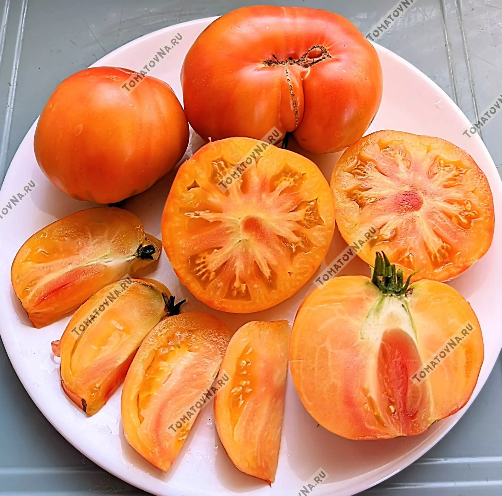 Каждый томат на кусте — уникальное произведение природы, найти два абсолютно одинаковых невозможно. Форма плодов преимущественно плоскоокруглая, часто с заметной, но неглубокой ребристостью в области плодоножки. Такая структура делает их устойчивыми на поверхности при хранении.