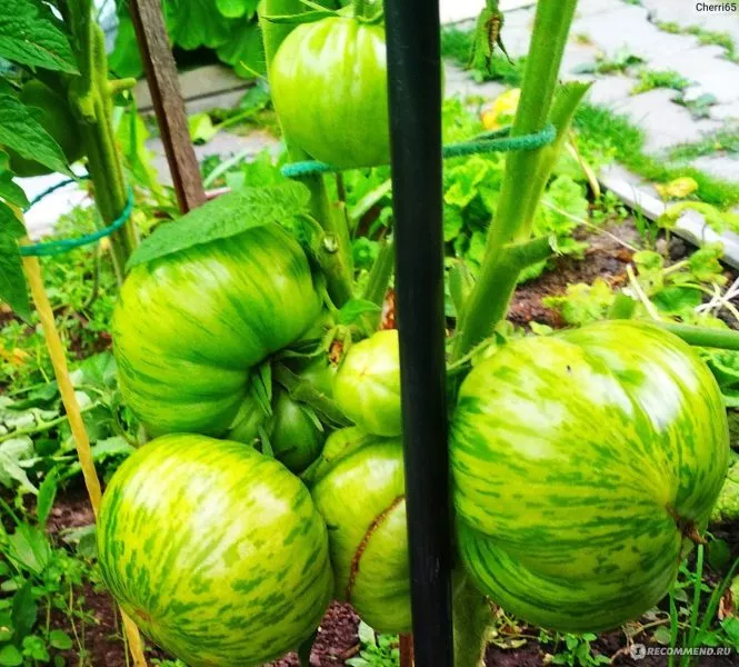 Внешний вид куста с многочисленными тяжелыми, полосатыми плодами делает этот сорт высокодекоративным. Он может стать украшением не только грядки, но и высокого контейнера или теплицы, где демонстрирует свой максимальный рост.