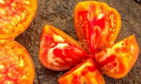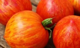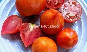Окраска зрелого томата уникальна и декоративна: основной фон — глубокий, насыщенный красный, по которому проходят контрастные золотисто-желтые полосы и разводы. Такой окрас — не просто игра природы, а индикатор высокого содержания полезных пигментов: красного ликопина и желтых каротиноидов (бета-каротина). Интенсивность полосатости может варьироваться в зависимости от степени освещенности плода и температурных условий во время созревания.