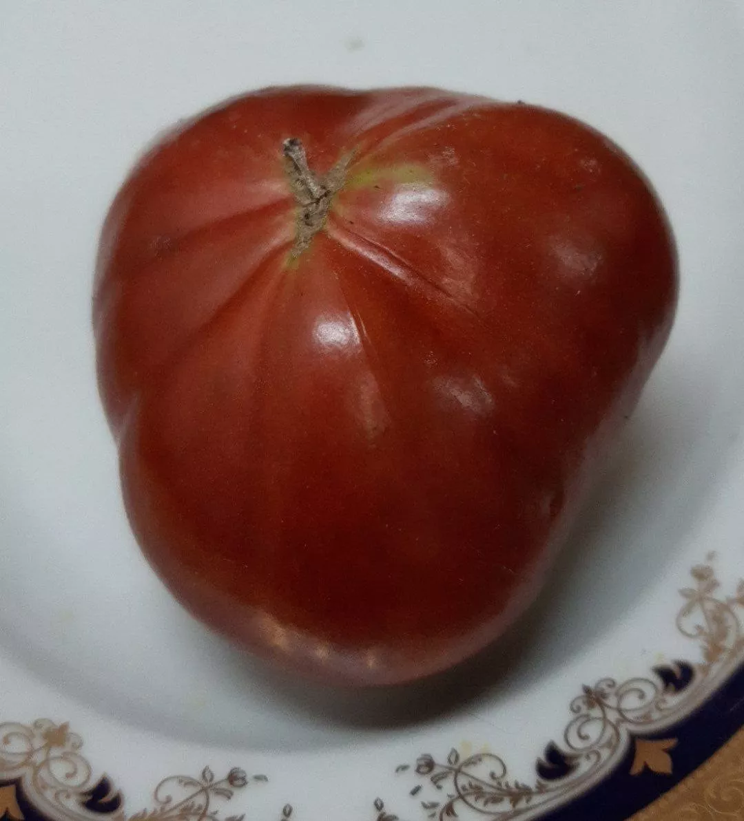 Плоды плоскоокруглой формы, часто с легкой ребристостью у плодоножки. Средняя масса составляет 250-300 граммов. Незрелые томаты имеют темно-зеленое пятно у основания, которое по мере созревания исчезает.