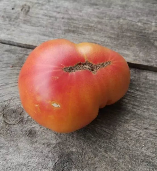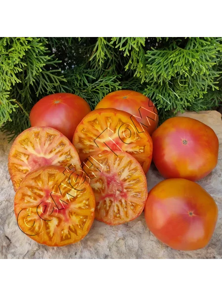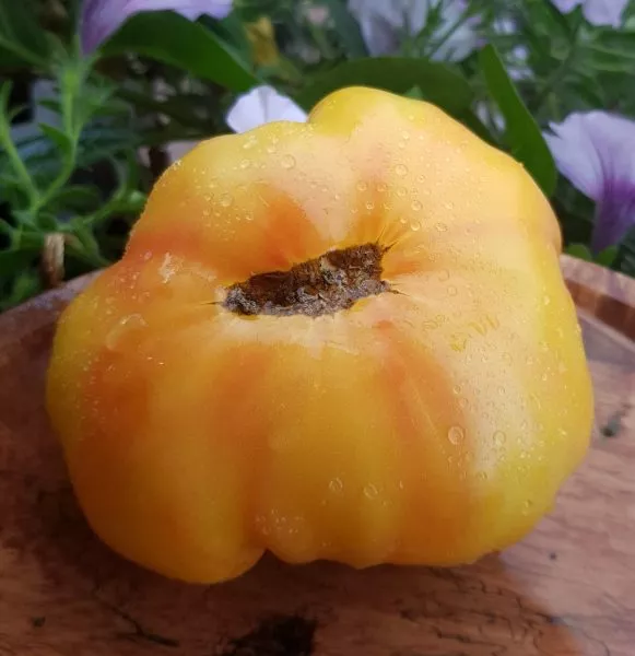 Главная визуальная привлекательность сорта заключена в плодах. Их форма плоскоокруглая, с выраженными, иногда ребристыми «плечиками», что характерно для многих биф-томатов (крупноплодных сортов с мясистой мякотью).