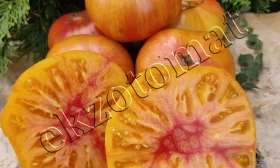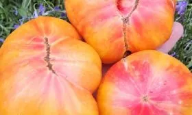 Итоговый вид зрелого плода — это сочетание теплого желто-оранжевого цвета с яркими розовыми мазками. Такой экзотический и праздничный внешний вид обеспечивает высокую товарность и делает эти томаты особенно привлекательными для свежего потребления и рыночных продаж.