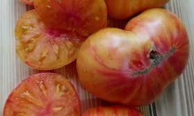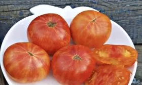 Плоды имеют характерную плоскоокруглую форму с пухлыми «плечиками». У основания, у плодоножки, отчетливо заметна ребристость, которая придает помидорам старинный, благородный вид. Такая форма типична для многих биф-томатов (крупноплодных сортов с мясистой мякотью).