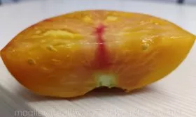 Внутренняя структура также соответствует этому типу: плоды многокамерные, с небольшим количеством семян. Мякоть очень плотная, мясистая и сочная, ее часто описывают как «арбузную» из-за сахаристой текстуры на изломе. Несмотря на крупный размер, достигающий 300 граммов, плоды защищены от растрескивания прочной, но не грубой кожицей.
