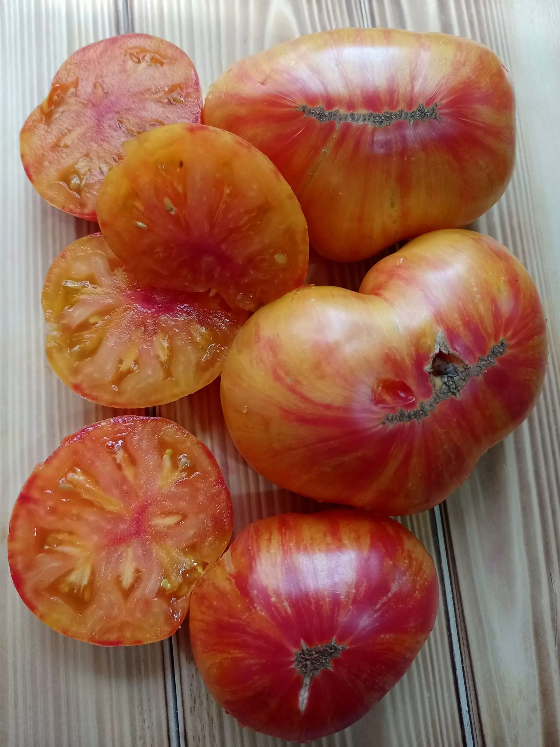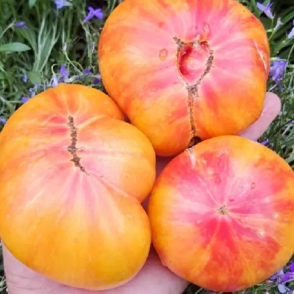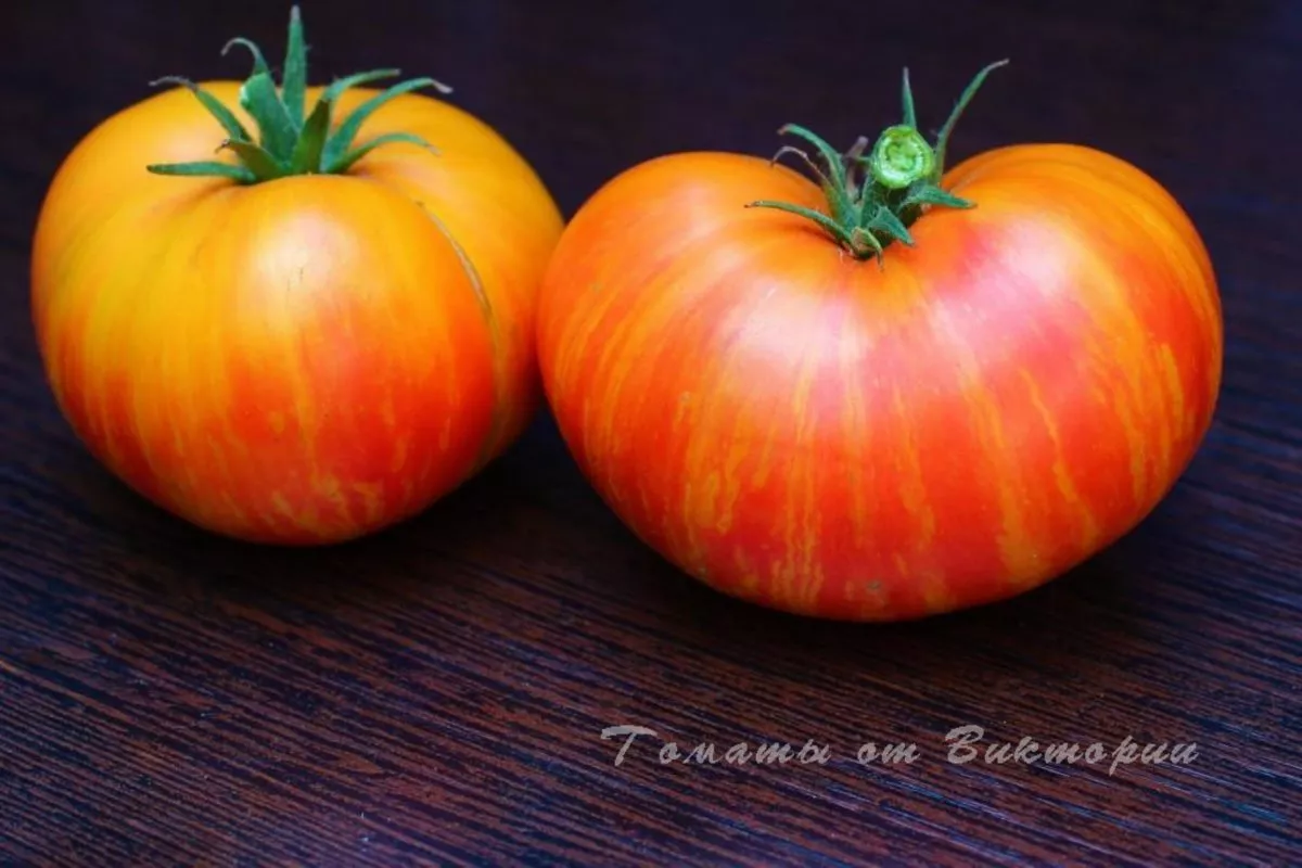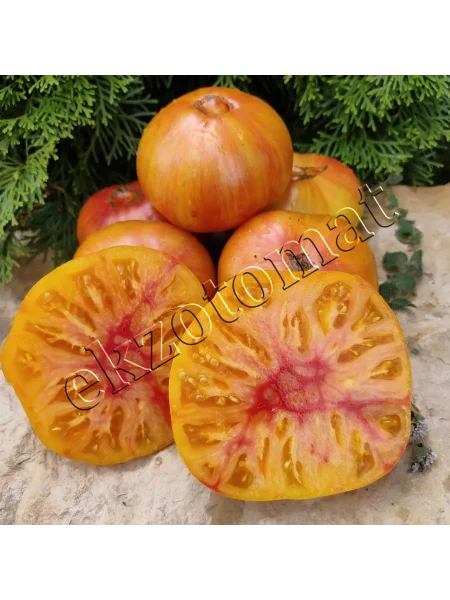 Итоговый вид зрелого плода — это сочетание теплого желто-оранжевого цвета с яркими розовыми мазками. Такой экзотический и праздничный внешний вид обеспечивает высокую товарность и делает эти томаты особенно привлекательными для свежего потребления и рыночных продаж.