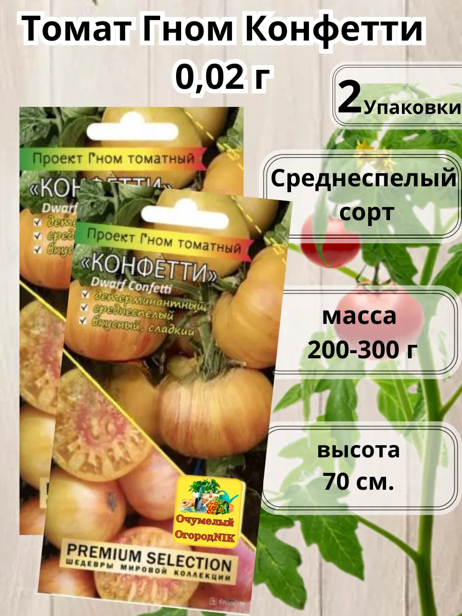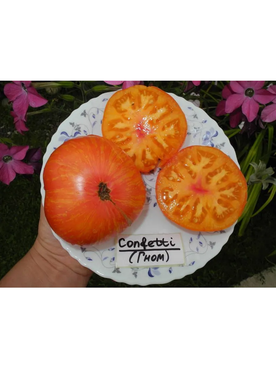 Томат «Гном Конфетти» — яркий и продуктивный сорт для любого огорода. Его главная «фишка» — необычные плоды: крупные, желто-оранжевые с розовыми полосами и отличным вкусом. Этот низкорослый, но урожайный томат одинаково хорошо растет и в грунте, и в горшке, открывая возможности для любого садовода.