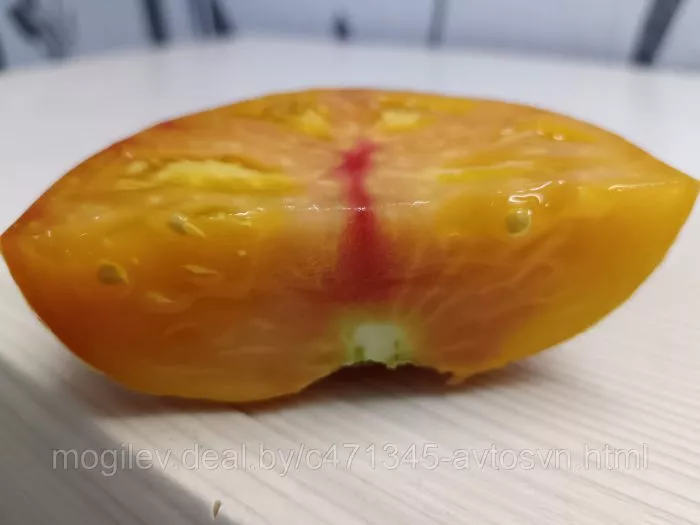 Внутренняя структура также соответствует этому типу: плоды многокамерные, с небольшим количеством семян. Мякоть очень плотная, мясистая и сочная, ее часто описывают как «арбузную» из-за сахаристой текстуры на изломе. Несмотря на крупный размер, достигающий 300 граммов, плоды защищены от растрескивания прочной, но не грубой кожицей.