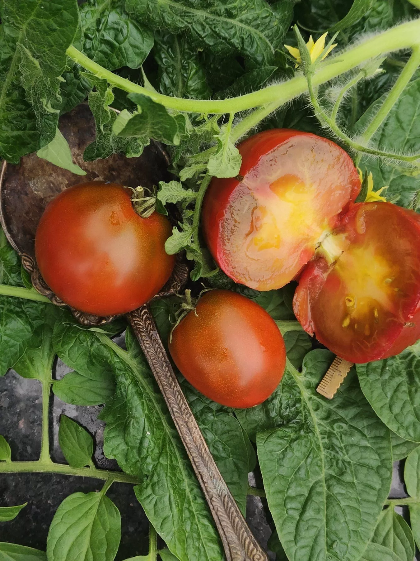 Мякоть мясистая, сочная, но при этом достаточно плотная, с небольшим количеством семян. Сочетание необычного цвета и сложного вкусового букета делает эти томаты особенно ценными для свежего потребления и приготовления ярких салатов.