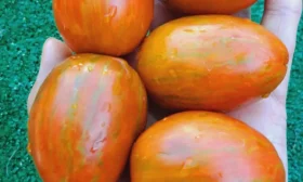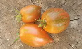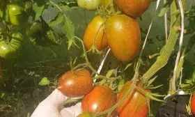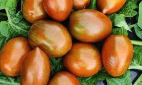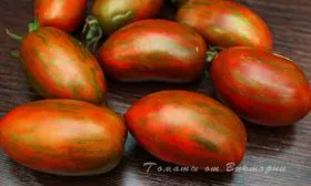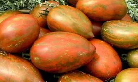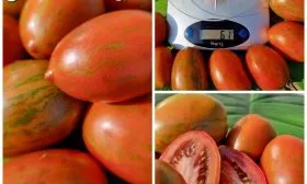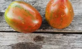 Окрас зрелого томата уникален и служит надежным индикатором спелости. Он представляет собой глубокий кирпично-коричневый фон, покрытый контрастными бронзовыми штрихами и полосками. Такой необычный цвет обусловлен высоким содержанием антоцианов — природных пигментов, являющихся сильными антиоксидантами.