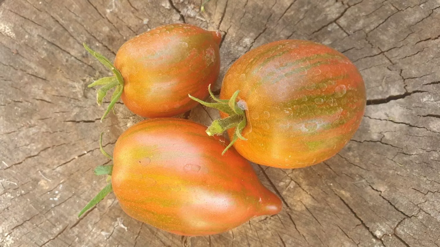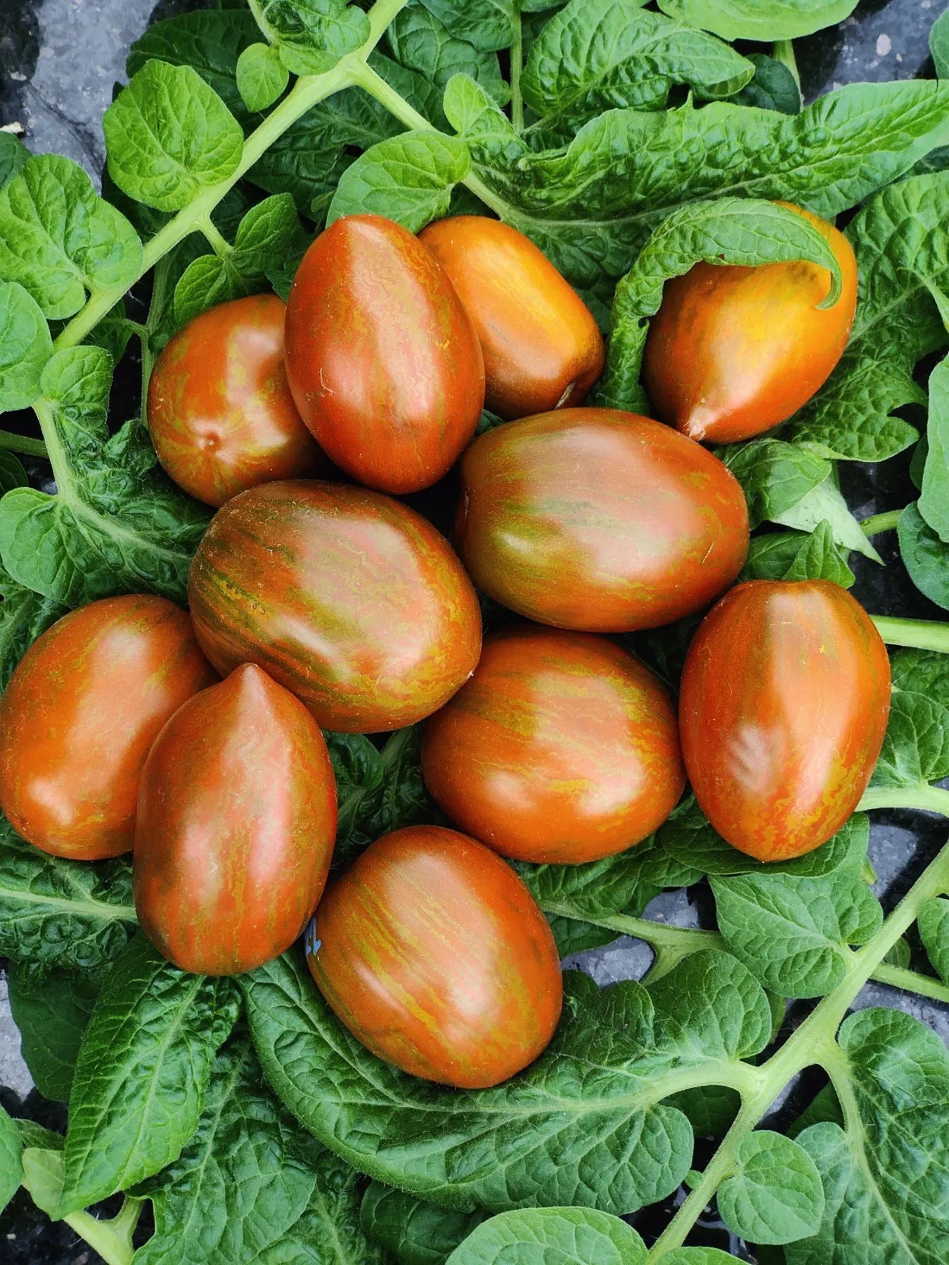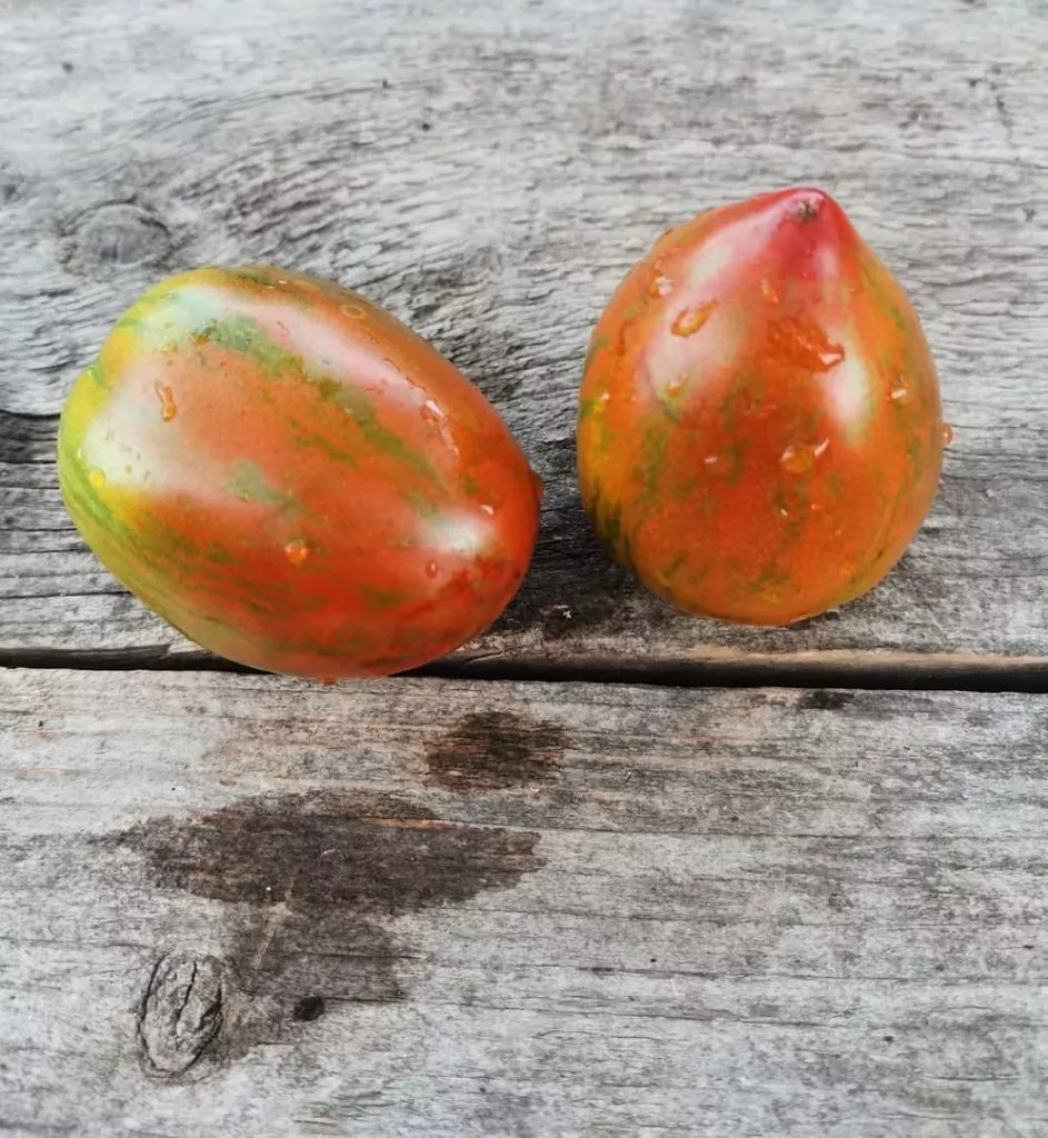 Окрас зрелого томата уникален и служит надежным индикатором спелости. Он представляет собой глубокий кирпично-коричневый фон, покрытый контрастными бронзовыми штрихами и полосками. Такой необычный цвет обусловлен высоким содержанием антоцианов — природных пигментов, являющихся сильными антиоксидантами.