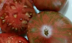 Мякоть очень плотная, сахаристая и многокамерная, с небольшим количеством семян. Благодаря плотной структуре плоды не растекаются при нарезке, отлично держат форму в салатах и на бутербродах.