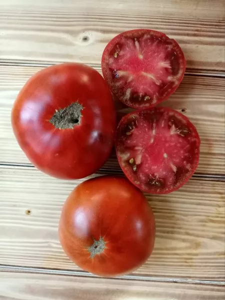 Плоды имеют классическую плоскоокруглую форму, которая часто сопровождается выраженной, иногда даже гофрированной ребристостью в области плодоножки. Эта ребристость – характерный сортовой признак, подчеркивающий «старомодный» облик томата. В разрезе открывается многокамерная, очень мясистая мякоть с небольшим количеством семян.