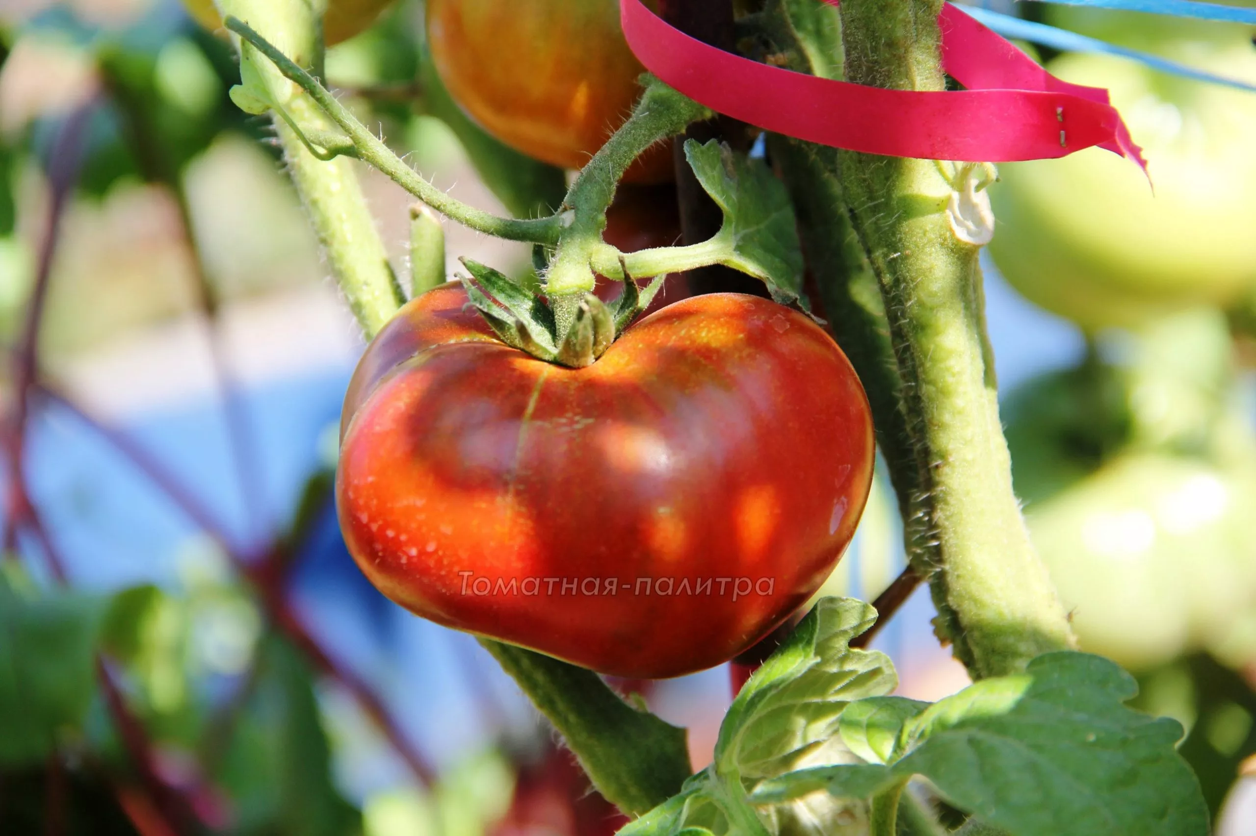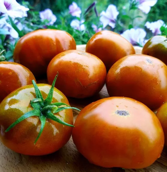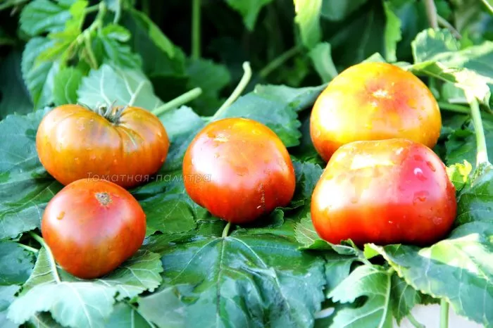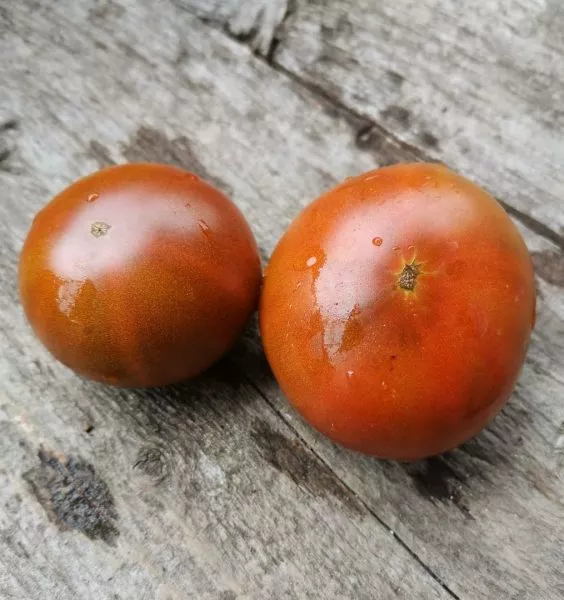 Главная внешняя особенность — уникальная окраска в полной биологической спелости. Основной цвет — глубокий шоколадно-красный, который на солнце приобретает характерный медный или бронзовый отлив. Этот насыщенный цвет обусловлен высоким содержанием антоцианов и ликопина в кожице и мякоти.