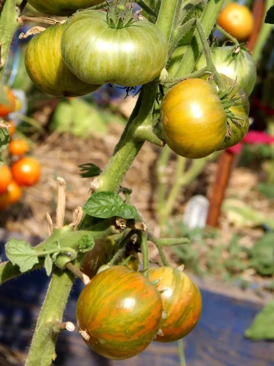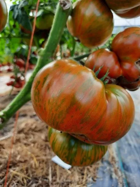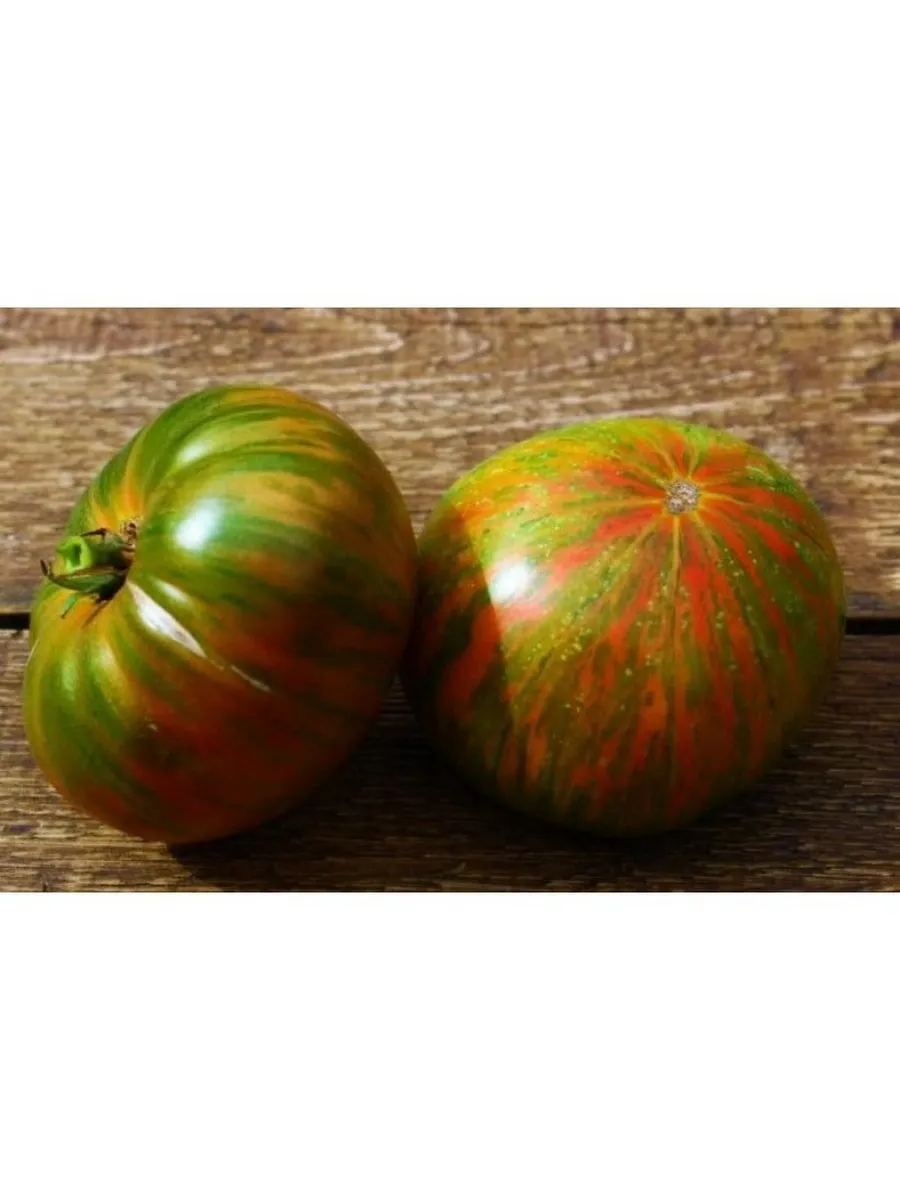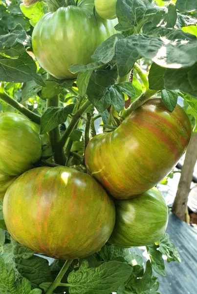 Главное чудо сорта раскрывается на стадии созревания. Плоды завязываются кистями по 3-5 штук. Изначально зеленые, они постепенно начинают «играть красками». На красном основном фоне проявляется хаотичный, неповторяющийся рисунок из тонких зеленых и желтых полосок, штрихов и мраморных разводов. Каждый томат уникален, найти два абсолютно одинаковых невозможно.