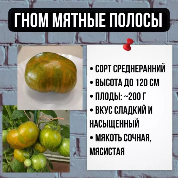 Томат «Гном Мятные полосы» — уникальный сорт, который удивляет не только яркой полосатой окраской, но и отличным вкусом. Эти среднеспелые индетерминантные растения дают обильный урожай довольно крупных плодов с освежающим, фруктовым вкусом. В статье мы подробно разберем все особенности выращивания и ухода за этим необычным томатом.