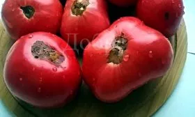 Окраска зрелого плода — равномерный красный цвет без зеленого пятна у плодоножки. Кожица достаточно плотная, чтобы выдерживать термическую обработку при мариновании и засолке, но при этом не воспринимается как грубая при употреблении в свежем виде.