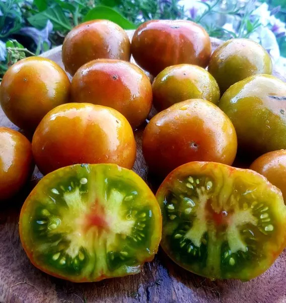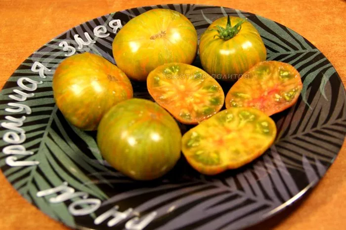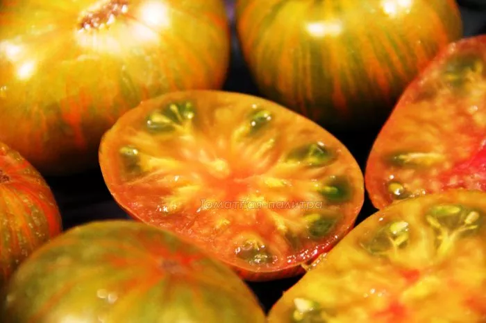 Окрас — ключевая отличительная черта сорта. В фазе полной зрелости основной фон плода становится насыщенным коричневым, на котором контрастно проступают зеленые или оливковые штрихи и разводы. Интенсивность этого рисунка может варьироваться в зависимости от степени освещенности и температуры. Мякоть внутри имеет глубокий красно-коричневый оттенок, она многокамерная, очень мясистая и сочная, с небольшим количеством семян.