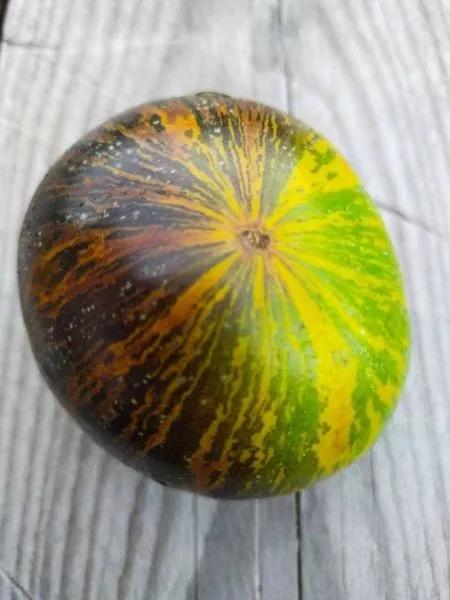 Внешний вид плодов — его вторая «визитная карточка». Окраска описывается как сложная: на основной оливковой кожице проявляются яркие оранжевые и зеленые штрихи и полосы. Такой пёстрый, «акварельный» эффект делает урожай не только пищевым, но и декоративным. Важно отметить, что эта окраска является сортовым признаком, а не показателем незрелости.