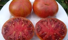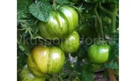 - Внешний вид плодов: Плоды плоскоокруглой формы, в биологической спелости приобретают темно-вишневый (почти шоколадный) основной окрас с характерными контрастными оливково-зелеными полосками. Такая необычная расцветка — визитная карточка сорта.