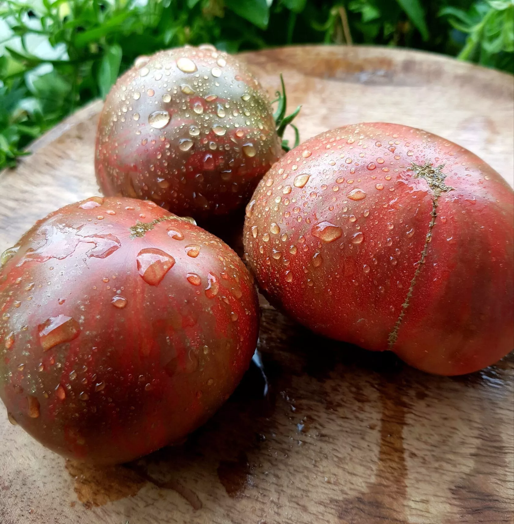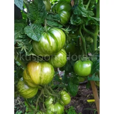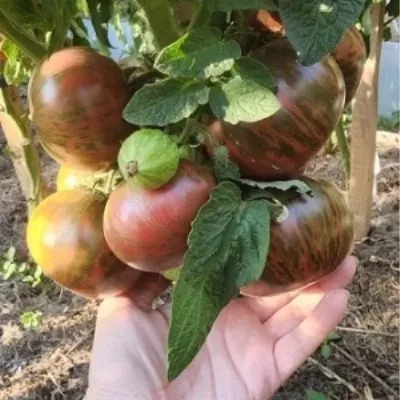 - Внешний вид плодов: Плоды плоскоокруглой формы, в биологической спелости приобретают темно-вишневый (почти шоколадный) основной окрас с характерными контрастными оливково-зелеными полосками. Такая необычная расцветка — визитная карточка сорта.