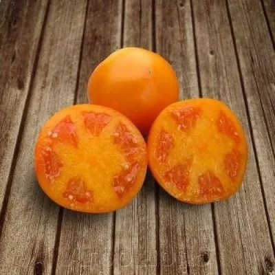 Форма плодов плоско-округлая, часто с легкой ребристостью в области крепления к плодоножке. Средняя масса, согласно характеристикам, составляет 250-300 граммов, поэтому кисти нуждаются в дополнительной поддержке. Мякоть очень мясистая, плотная и многокамерная, с небольшим количеством семян. Окраска мякоти однородная, соответствует внешнему цвету, что указывает на высокое содержание каротиноидов.
