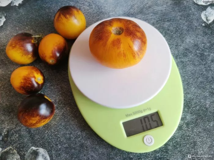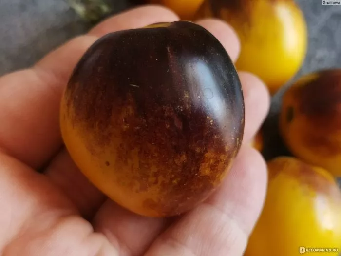Плоды имеют стабильную плоскоокруглую форму и среднюю массу от 160 до 190 граммов. Их главная отличительная черта — уникальный фиолетово-красный цвет в биологической спелости. Эта окраска — результат наложения антоцианового пигмента в кожице на красную мякоть плода.