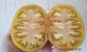 Мякоть созревшего томата сочная, нежная и мясистая, преимущественно оранжево-красного оттенка. Количество семенных камер невелико. Кожица у плодов тонкая, что с одной стороны положительно влияет на вкусовые ощущения, а с другой — накладывает ограничения на длительную транспортировку и требует аккуратного обращения при сборе.