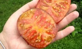 На срезе видна мясистая, сочная мякоть насыщенного оранжевого цвета. Семенные камеры выражены слабо, семян немного. Такая структура, характерная для биф-томатов, обеспечивает высокое содержание сухих веществ и сахаров.