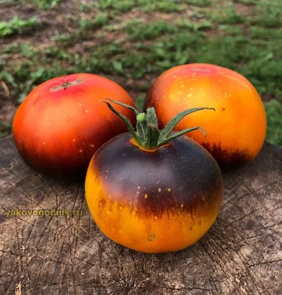 Плоды этого сорта по праву считаются его визитной карточкой. Их главная отличительная черта — уникальная двухцветная окраска. В стадии технической спелости они имеют зеленый цвет с темным пятном у плодоножки. По мере созревания основной тон меняется на ярко-оранжевый, а область плечиков (зона вокруг плодоножки) приобретает глубокий фиолетовый или синевато-фиолетовый антоциановый румянец.