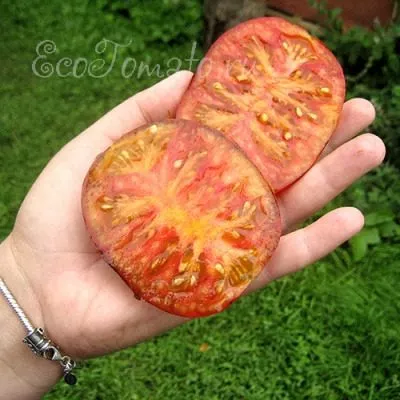 На срезе видна мясистая, сочная мякоть насыщенного оранжевого цвета. Семенные камеры выражены слабо, семян немного. Такая структура, характерная для биф-томатов, обеспечивает высокое содержание сухих веществ и сахаров.
