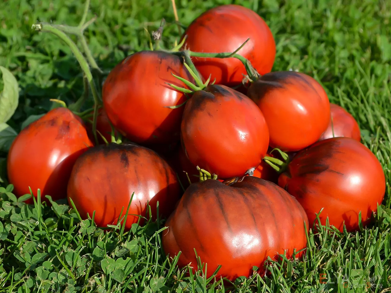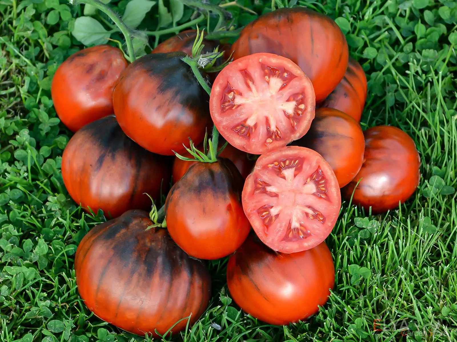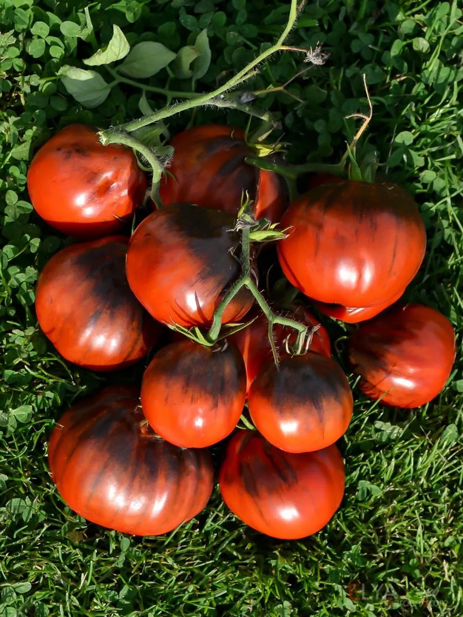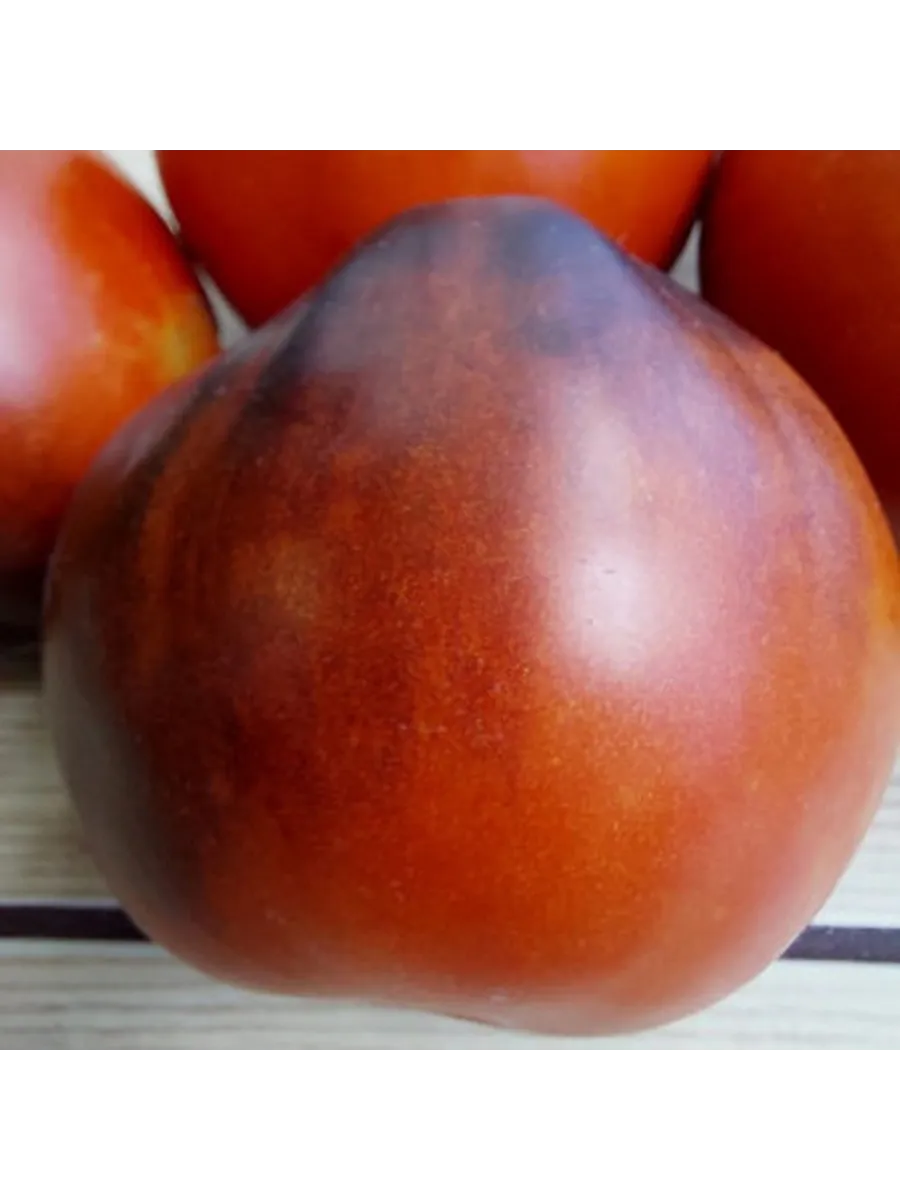 Незрелые томаты имеют характерное темно-зеленое пятно у плодоножки с антоциановым (фиолетовым) оттенком. По мере созревания основной цвет наливается теплым оранжево-красным тоном, а «плечики» вокруг плодоножки сохраняют насыщенный фиолетово-бурый антоциановый «загар».