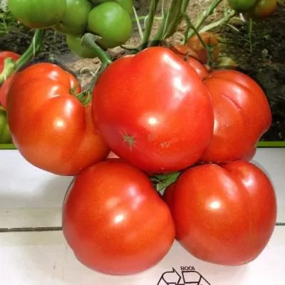 При полном созревании томаты приобретают равномерный, насыщенный красный цвет. Мякоть отличается высокой плотностью и мясистостью, семенных камер мало, сокосодержание высокое. Плотная, но не жесткая кожица надежно защищает от растрескивания даже при колебаниях влажности почвы, что характерно для многих крупноплодных сортов.