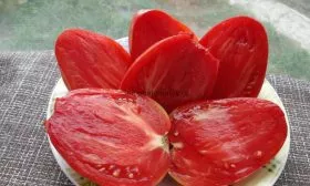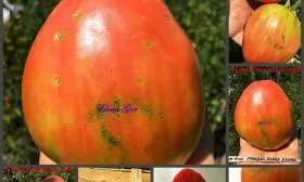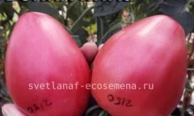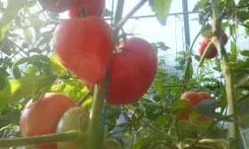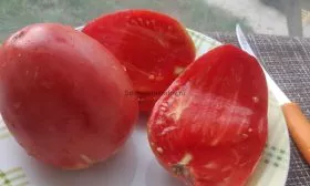 Заявленная высокая урожайность достигается именно за счет крупноплодности и длительного периода плодоношения, характерного для индетерминантных сортов. Плоды имеют вытянутую сердцевидную форму, что является их визитной карточкой. Масса томатов варьируется в широких пределах — от 150 до 400 граммов.