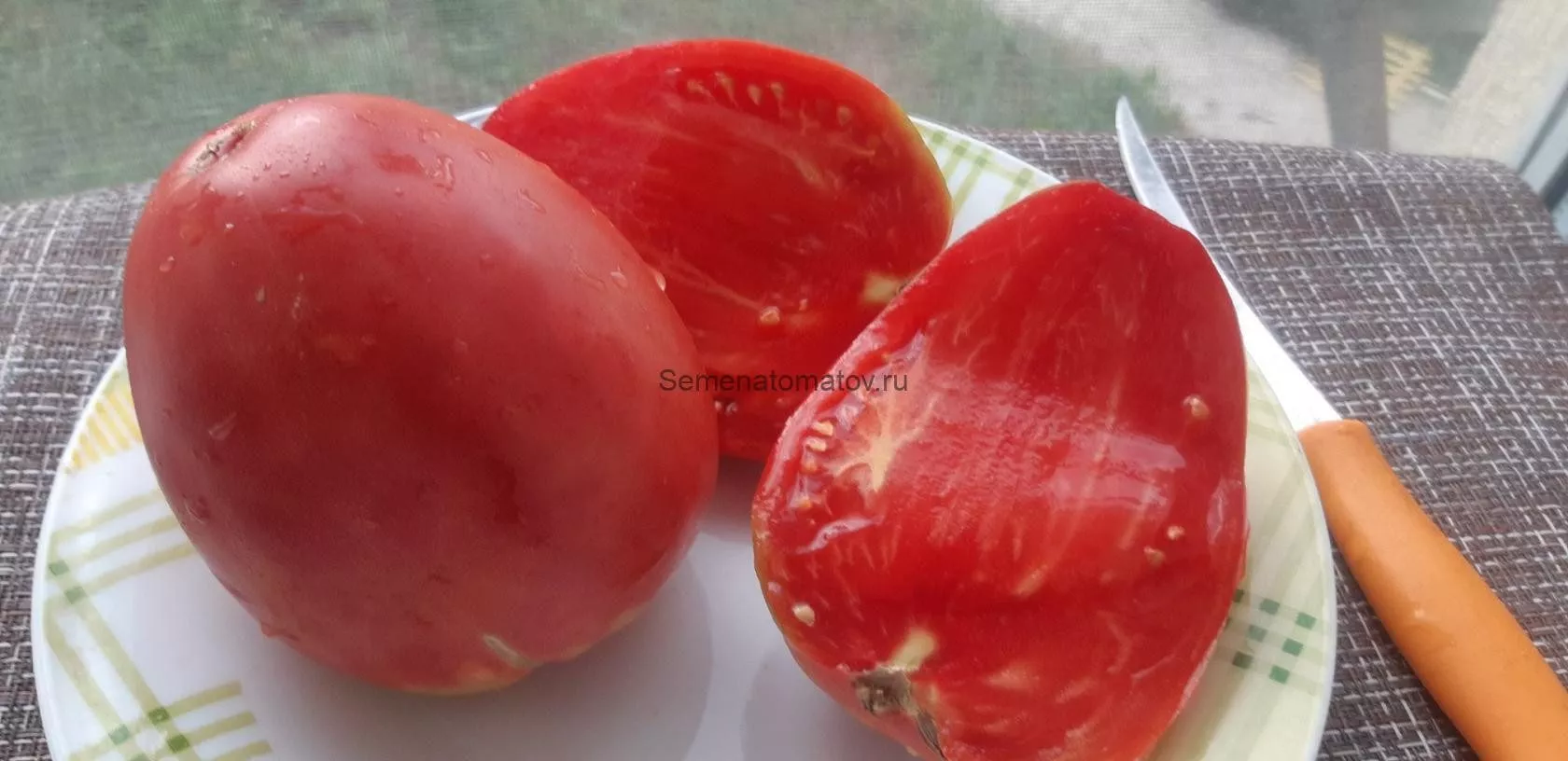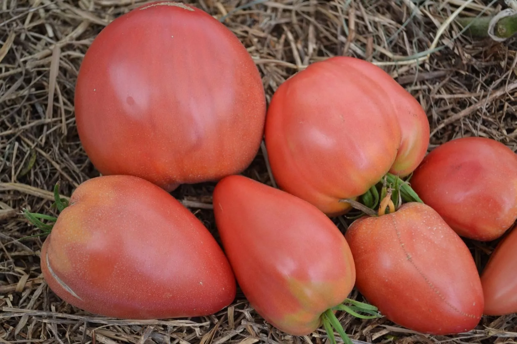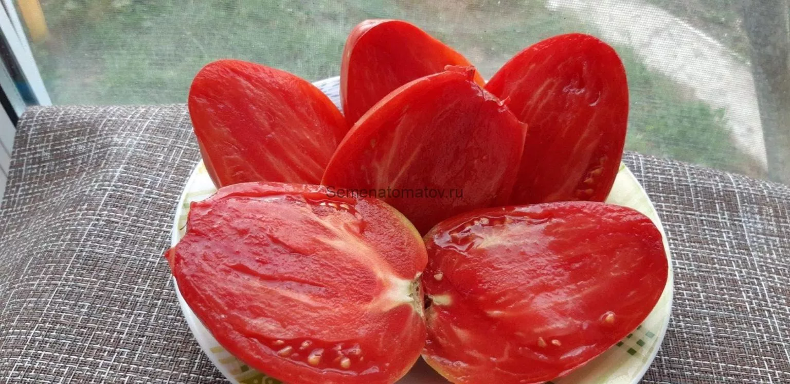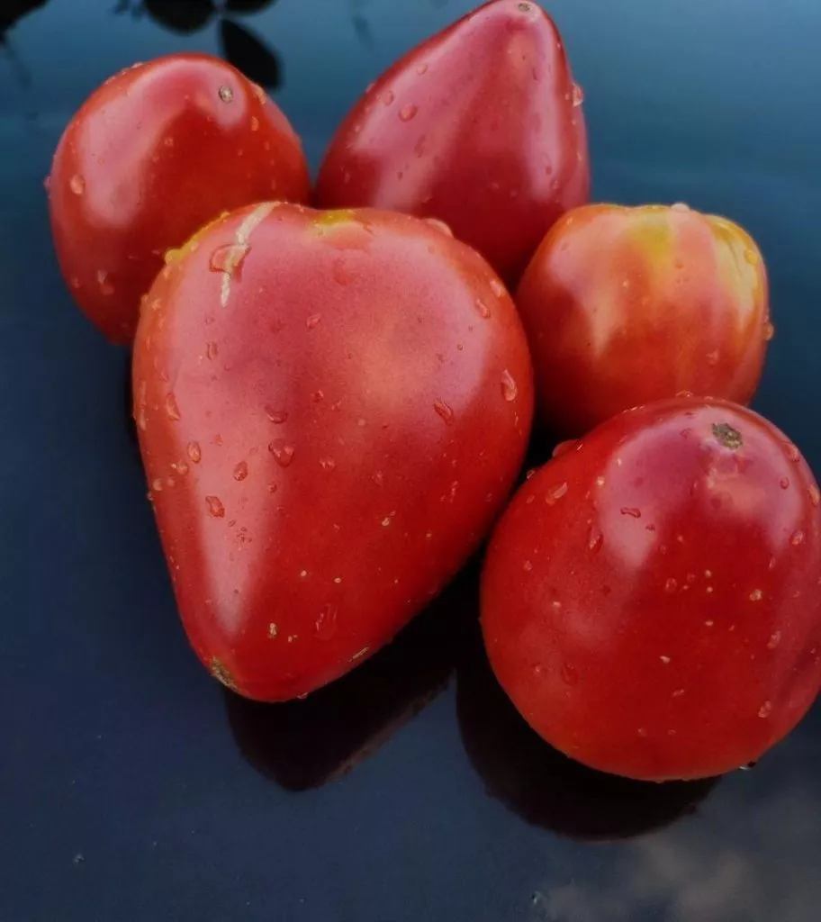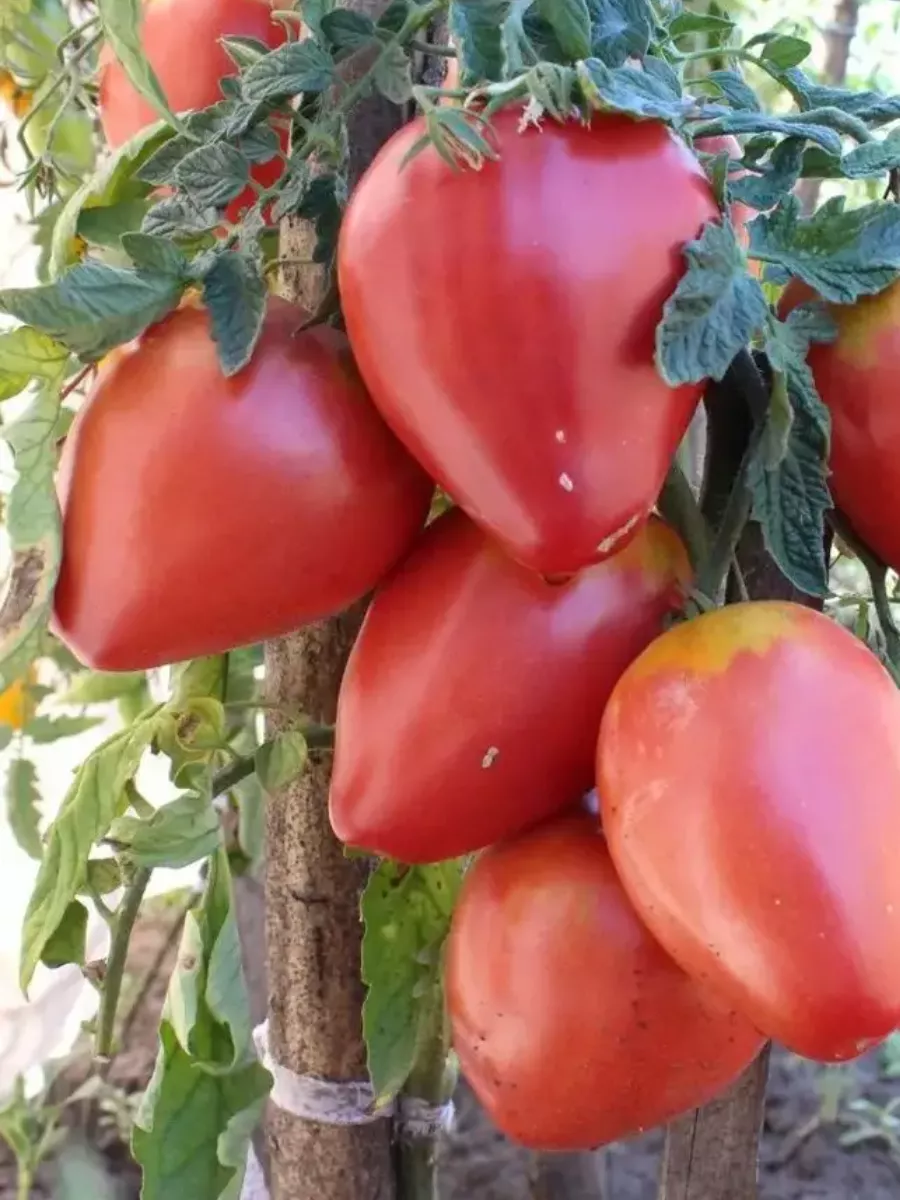 Именно плоды — визитная карточка этого сорта. Их вытянутая сердцевидная форма с выраженным острым «носиком» является одним из ключевых сортовых признаков, что отличает эти томаты от многих других сердцевидных сортов, имеющих более округлое основание.