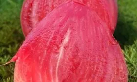 Окрас в стадии полной биологической зрелости — равномерный, насыщенный розовый, без зеленого или желтого пятна у плодоножки. Кожица тонкая, но плотная, что предохраняет крупные плоды от растрескивания при соблюдении режима полива.