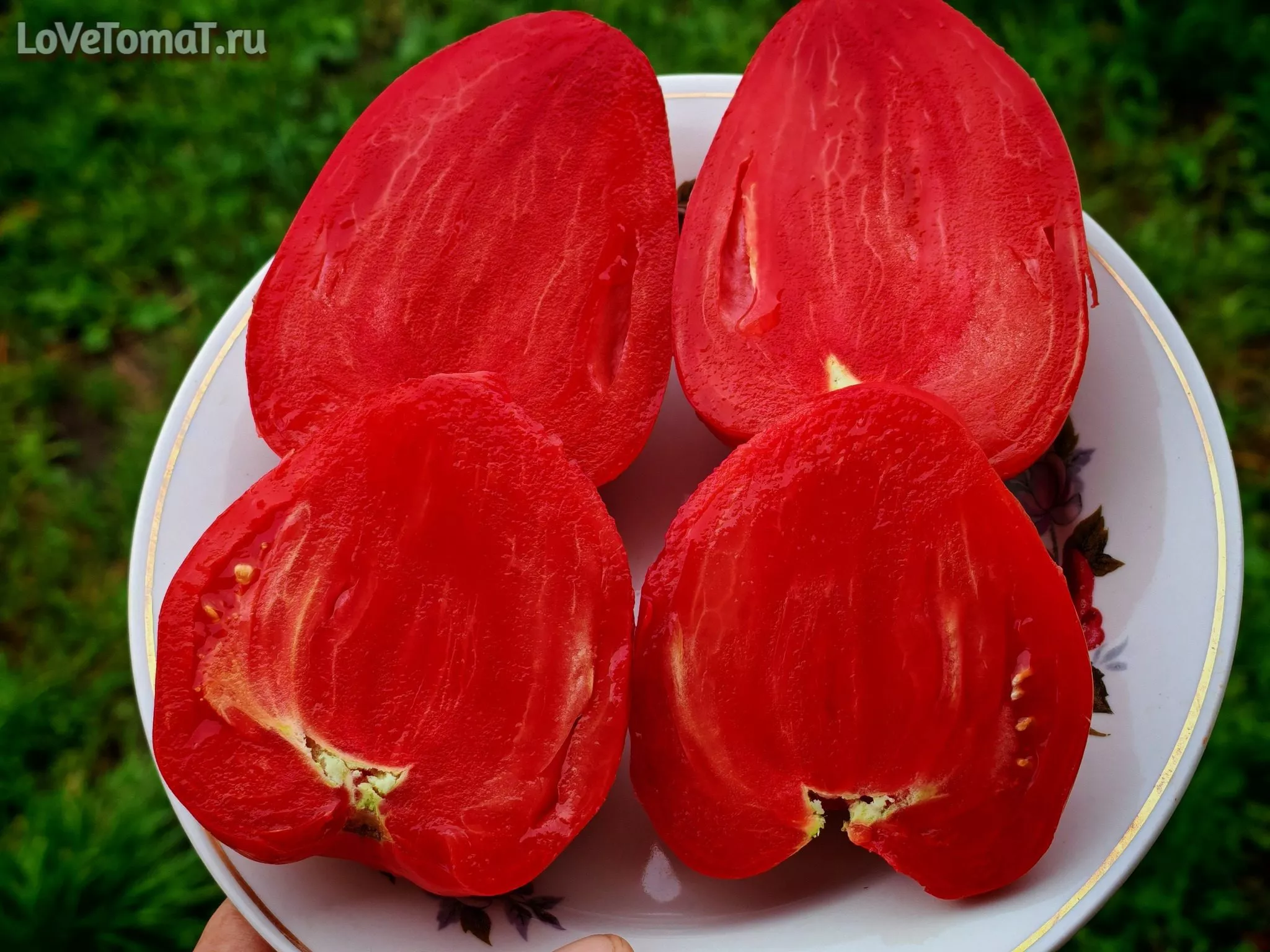 В стадии полной биологической зрелости окраска плодов становится насыщенной малиновой или розово-малиновой. Мякоть исключительно мясистая, плотная и сахаристая на изломе, с малым количеством семян. Для плодов характерен выраженный классический томатный аромат. Такая структура мякоти указывает на высокое содержание сухих веществ и сахаров.