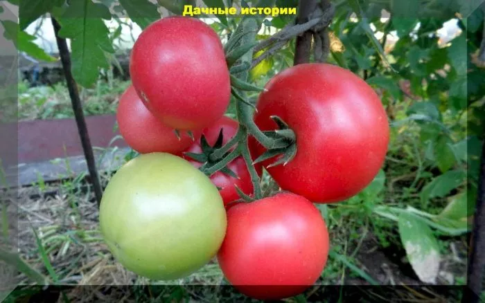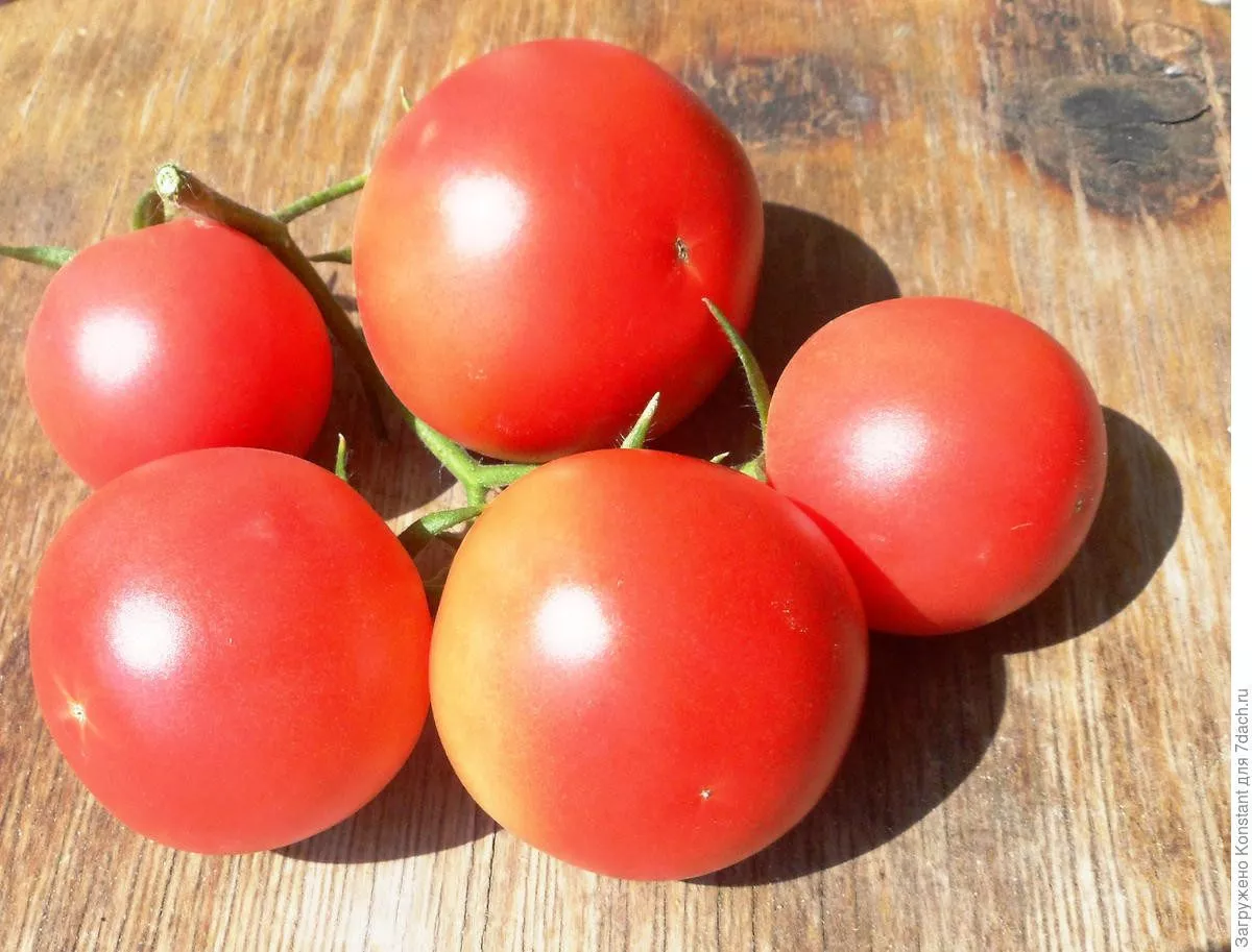 Плоды имеют классическую плоскоокруглую форму, часто с заметной ребристостью в области плодоножки. В технической спелости они окрашены в зеленый цвет с характерным темным пятном у основания, которое полностью исчезает при созревании. Зрелый томат приобретает равномерный насыщенный розовый окрас без зеленых пятен у плодоножки.