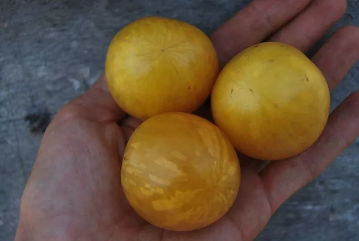 Мякоть у полностью созревших плодов сочная, нежная, с небольшим количеством семян. Вкус сладкий, с едва уловимой фруктовой ноткой и практически без кислоты, что характерно для многих желтоплодных сортов. Именно в стадии полной биологической зрелости, когда цвет становится по-настоящему медовым, раскрывается весь его вкусовой потенциал.