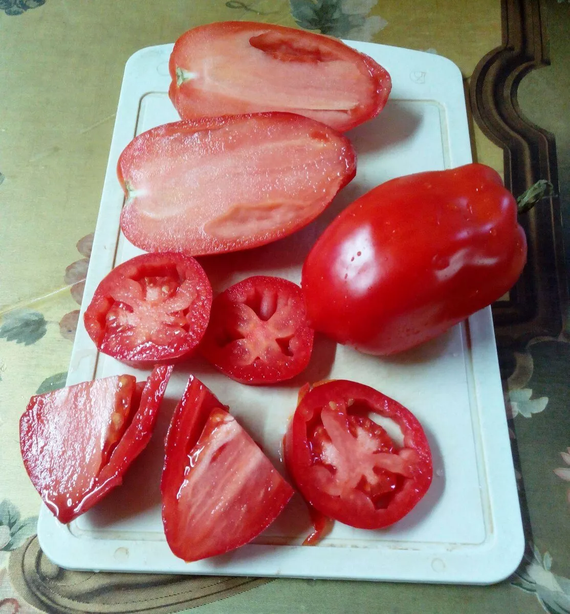 На разрезе мякоть демонстрирует высокую плотность и мясистость, так называемую «сахарную» структуру. Семенных камер немного, они компактные, а желеобразного сока содержится меньше, чем у стандартных салатных сортов. Это подтверждает универсальное назначение плодов: плотная консистенция делает их отличным выбором для переработки на соусы и пасту.