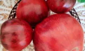 Окраска в состоянии полной биологической спелости — равномерная, насыщенно-малиновая, без зеленого пятна у плодоножки. Мякоть очень плотная, мясистая (т.н. сахарного типа), с выраженной многокамерностью. Семенных камер много, но самих семян в них содержится небольшое количество.
