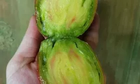 - Цвет: основной тон кожицы меняется с зеленого на темно-розовый или бордовый, но участки у плодоножки могут оставаться зеленоватыми или оливковыми.