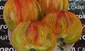 Главная отличительная черта сорта — сложная, неравномерная окраска. Описание «сочетание розового, коричневато-бордового, зеленого» лишь схематично передает реальную картину. Каждый томат — уникален: основным фоном чаще всего выступает насыщенный розовый или малиновый цвет, который у плодоножки (в области плечиков) переходит в дымчато-коричневые, оливковые или буро-зеленые разводы. Даже при полном биологическом созревании плод редко бывает однотонным, сохраняя элементы темного или зеленого оттенка у основания.