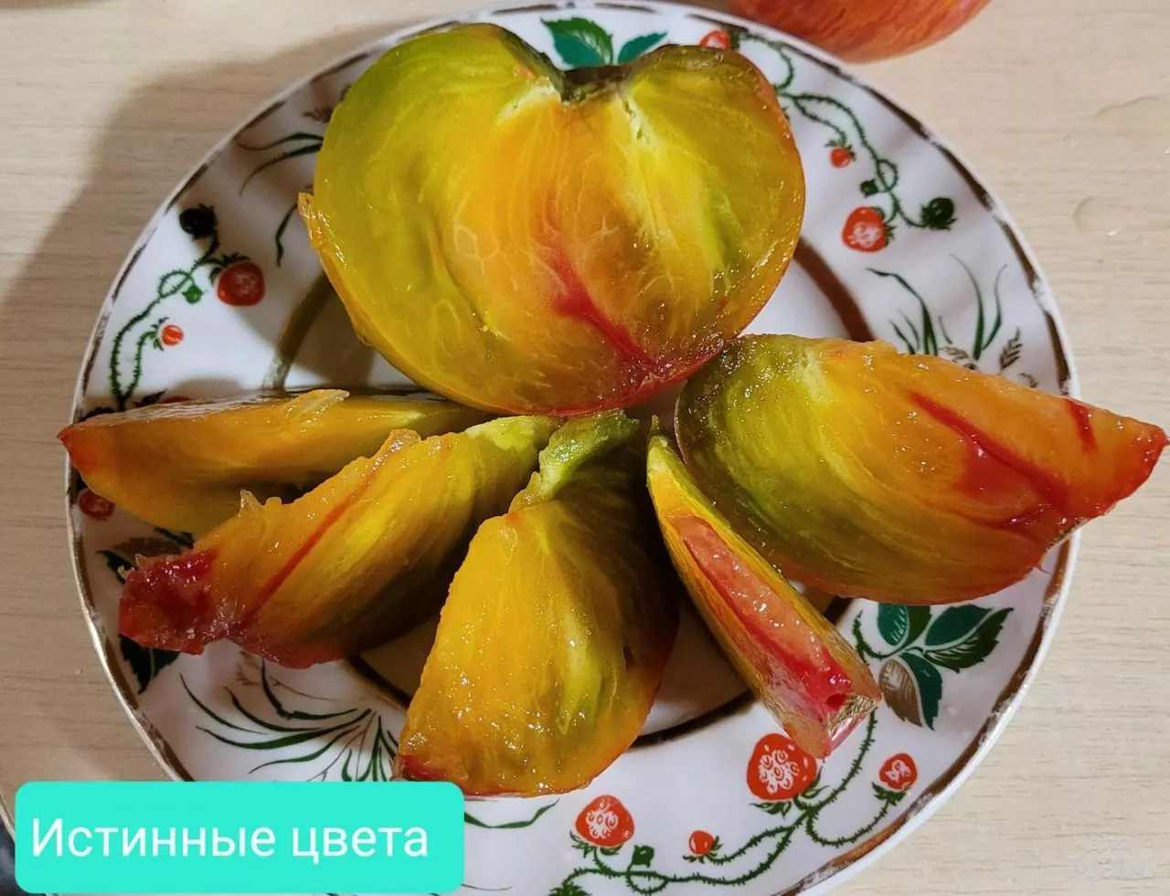 Главная «визитная карточка» Истинных цветов — это сложная, неравномерная окраска зрелого плода, описанная как сочетание розового, коричневато-бордового и зеленого. Такой полихромный эффект редко встречается даже среди биколорных (двуцветных) сортов. Окраска каждого плода индивидуальна и может меняться в зависимости от степени освещенности и температурных условий во время созревания. Эта особенность делает сорт чрезвычайно привлекательным для свежего потребления и украшения блюд.