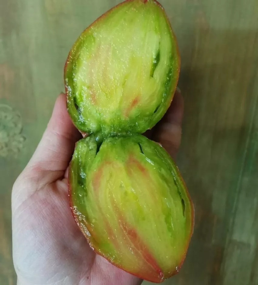 Минимальная, почти незаметная кислинка выполняет роль идеального баланса, лишь подчеркивая основную сладкую ноту и не допуская приторности. Мякоть при этом мясистая и сочная, а на изломе видна ее сахарная, зернистая структура, что характерно для биф-томатов высокого качества.