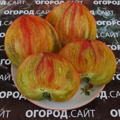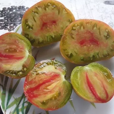 Главная отличительная черта сорта — сложная, неравномерная окраска. Описание «сочетание розового, коричневато-бордового, зеленого» лишь схематично передает реальную картину. Каждый томат — уникален: основным фоном чаще всего выступает насыщенный розовый или малиновый цвет, который у плодоножки (в области плечиков) переходит в дымчато-коричневые, оливковые или буро-зеленые разводы. Даже при полном биологическом созревании плод редко бывает однотонным, сохраняя элементы темного или зеленого оттенка у основания.